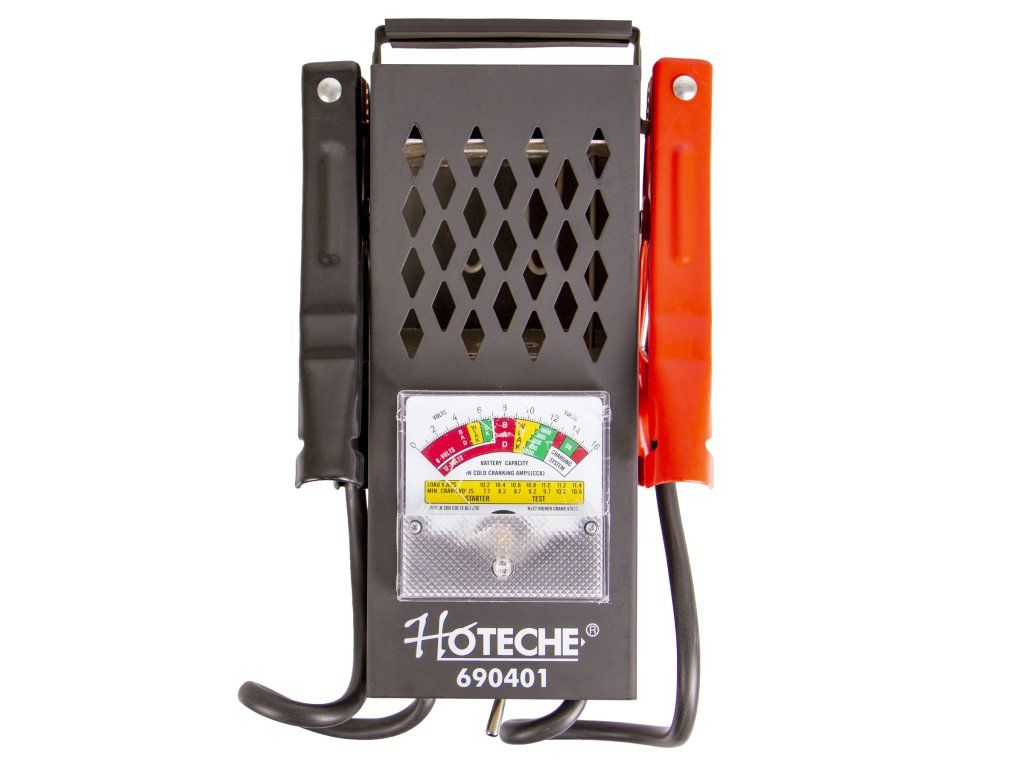 Analogový tester baterií od značky Hoteche s výsledkem měření do několika sekund.