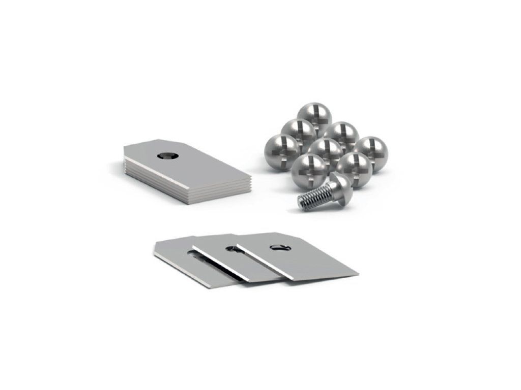 Devět kusů náhradních nožů a šroubů.