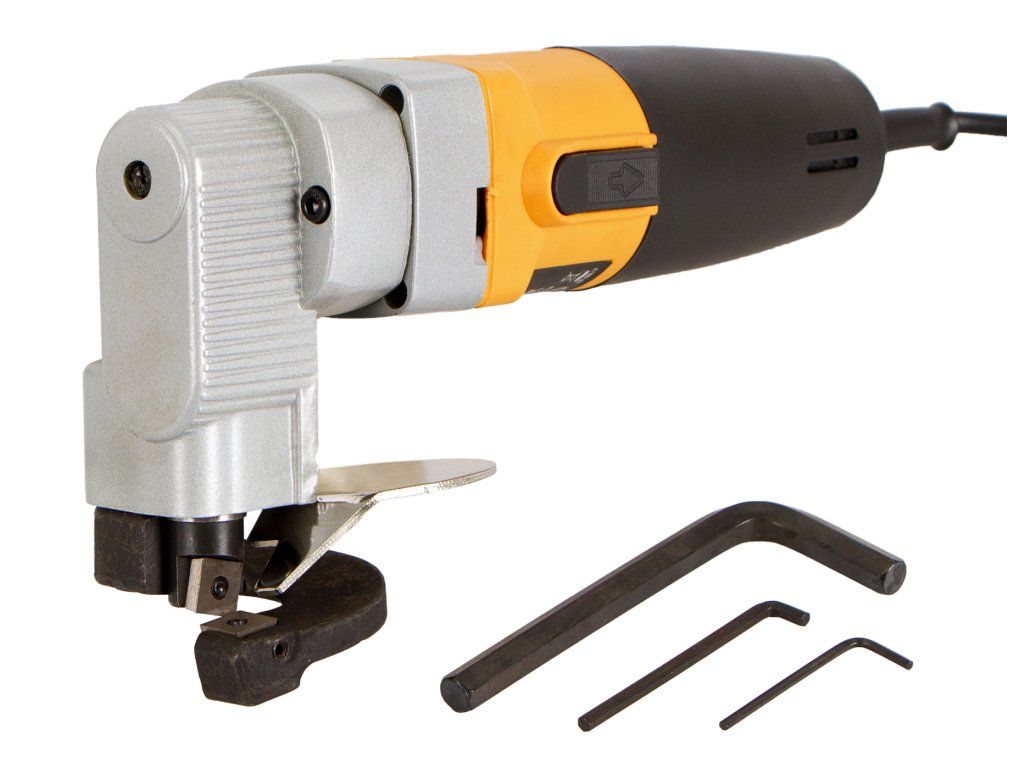 Silné a kompaktní elektrické nůžky na plech od značky Hoteche s příkonem 500 W dokážou řezat/stříhat plech o šířce až 2,5 mm.