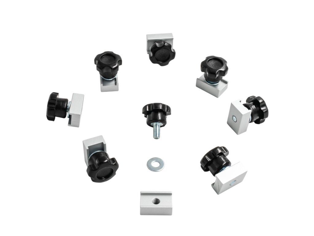 Tato sada je určena pro rozšíření využití pravítek s rychloupínáním. Dvě pravítka položte na sebe horní plochou a zajistěte je pomocí čtyř spojovacích T-konektorů. Spojená pravítka připevněte spodními čelistmi k desce stolu. Pomocí upínacího systému horního pravítka upnete materiál. Díky nízkému profilu čelistí je pracovní povrch dobře dostupný pro opracování dřeva například horní frézkou, bruskou apod. Dvě spojená pravítka lze kdykoliv znovu rozebrat a používat je opět samostatně. Sadou 8 konektorů spojíte dvě dvojice pravítek.