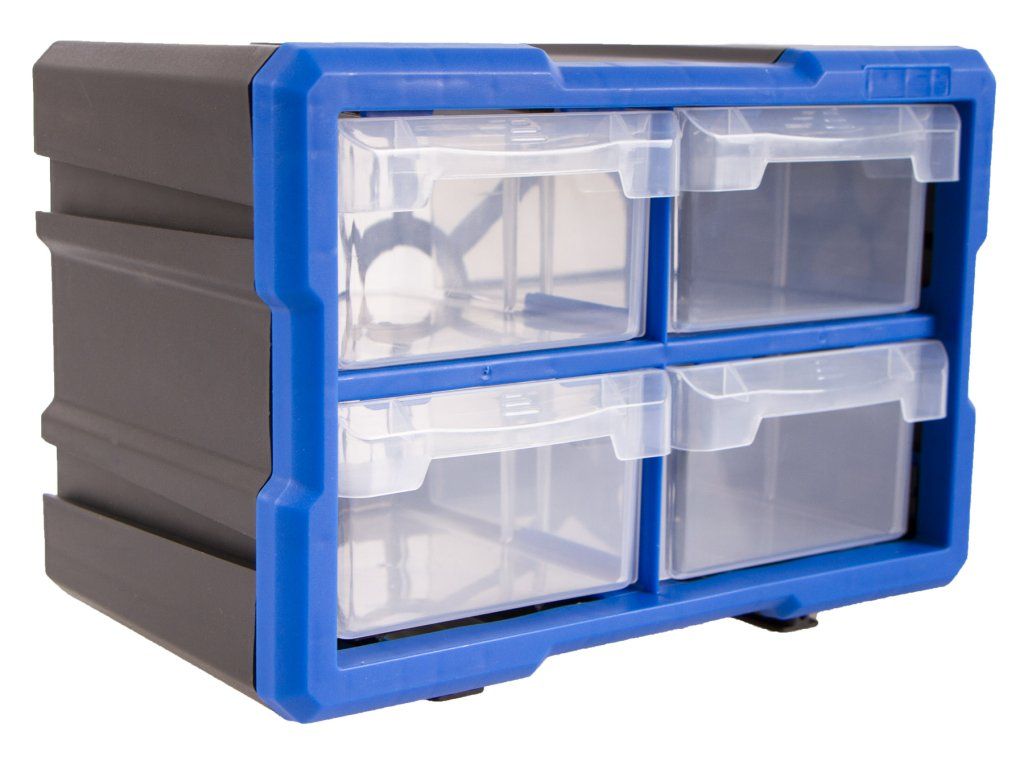 Plastový organizér se 4-mi středně velkými průhlednými boxy, vhodný např. pro uskladnění a přehledné rozdělení šroubků, matic a dalšího nářadí, které by se mohlo zakutálet a ztratit. Každý box má jednu přepážku, kterou můžete vyndat, takže si u každého boxíku můžete vybrat, jestli chcete jedno nebo dvě skladovací místa.
