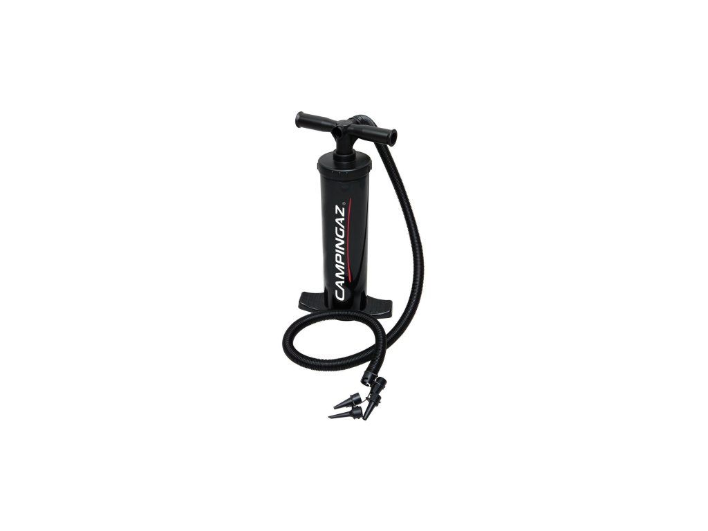 Ruční pumpa pro nafukování a vyfukování. Součástí výrobku jsou 3 adaptéry pro různé ventily a transportní obal.