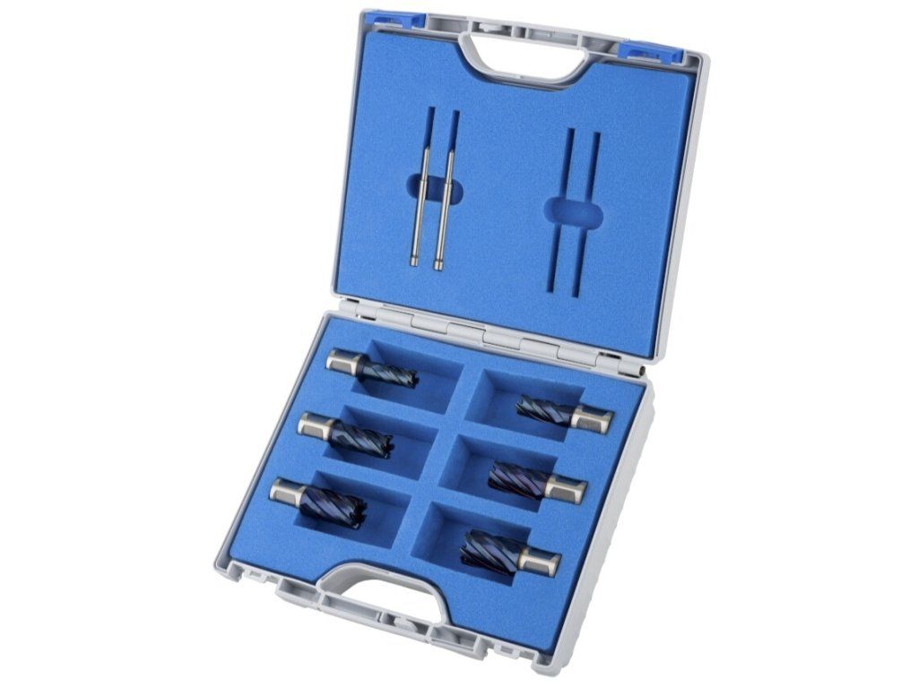 Sada šesti špičkových vrtáků a dvou středících kolíků řady Karnasch BLUE-LINE 30 v praktickém kufru.