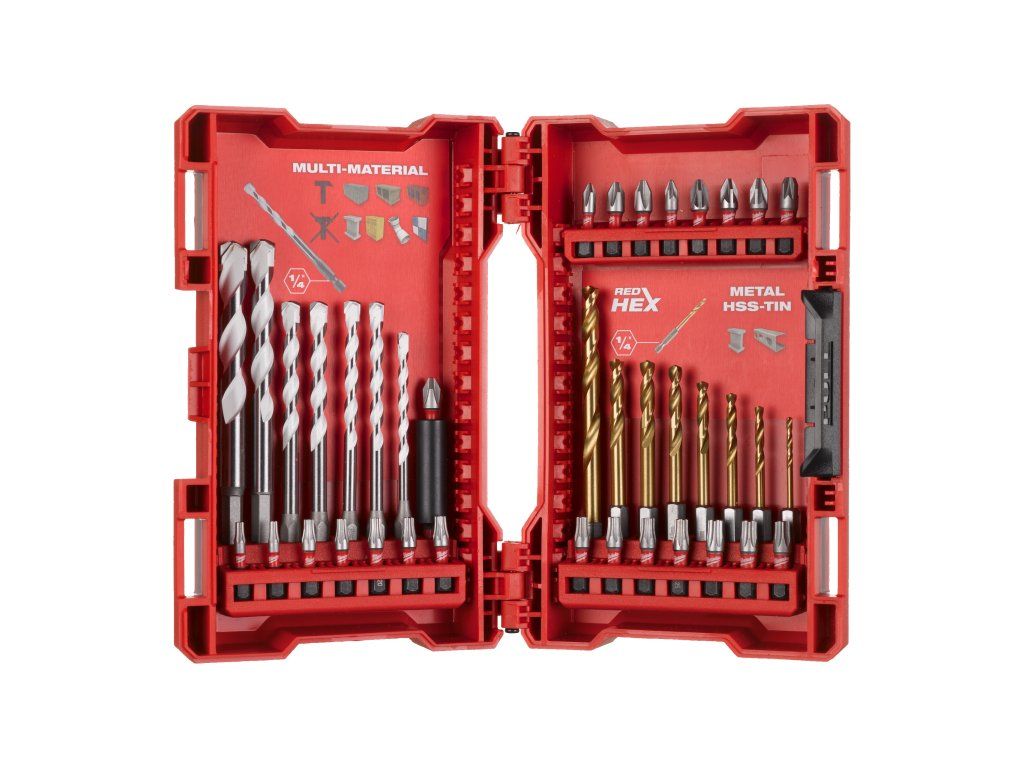 - Obsahuje - 8× vrtáky na kov SHOCKWAVE™ 1/4" Hex: ⌀ 2 / 3 / 3,5 / 4 / 4,5 / 2× 5 / 6 mm. 7× víceúčelové vrtáky SHOCKWAVE™ 1/4" Hex: ⌀ 4 / 5 / 5,5 / 2× 6 / 8 / 10 mm. 23× bity SHOCKWAVE™ 25 mm: PH1 / 3× PH2, PZ1 / 3× PZ2 / PZ3, 2× TX10 / 2× TX15 / 4× TX20 / 3× TX25 / 3× TX30. 1× magnetický držák bitů SHOCKWAVE™ 60 mm
