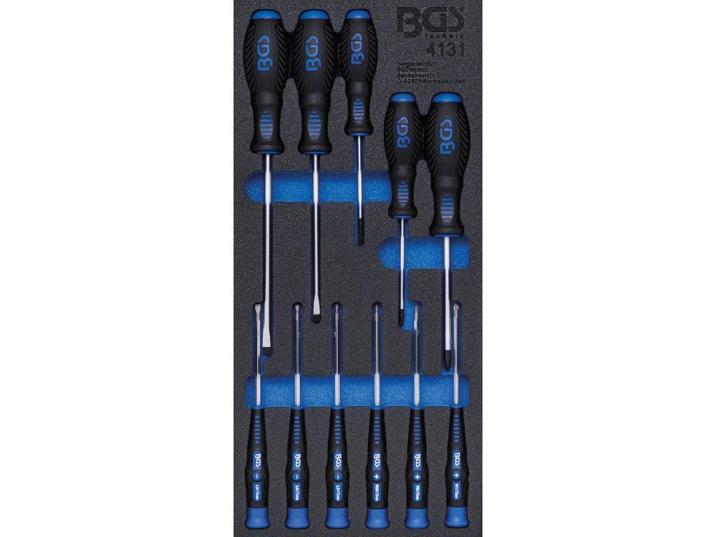 Pěnová vložka o rozměrech (š x h x v) 189 x 408 x 45 mm obsahuje celkem 11 ks kvalitních plochých a křížových šroubováků s protiskluzovou rukojetí.
