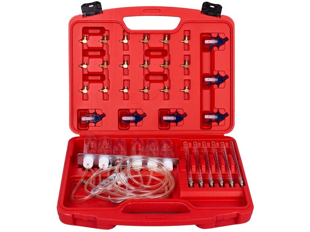 - Plastový kufřík obsahuje odměrné válce a nádoby a sortiment adaptérů pro připojení k systému Bosch, Delphi a Denso pro všechny běžně dostupné vozy.