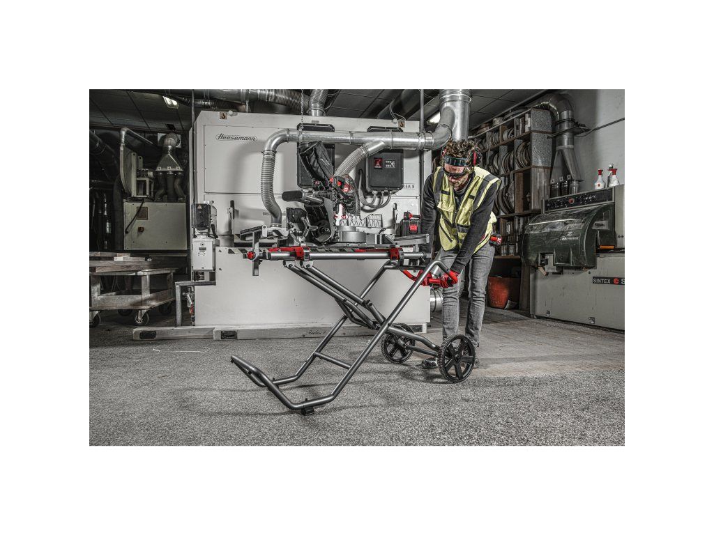 - Snadný jednočinný zámek nožního pedálu a jediný zvedací bod umožňují rychlé nastavení stojanu s připojenou pokosovou pilou