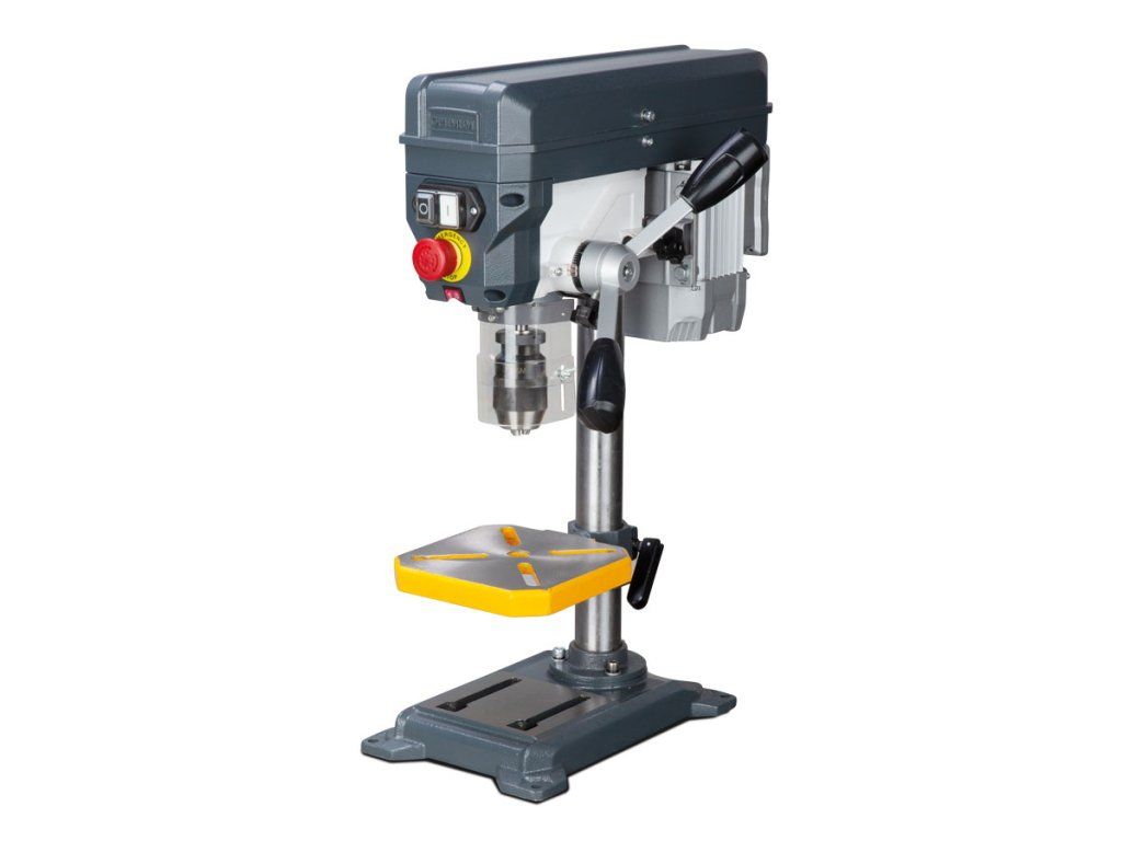 Stolní vrtačka určená pro hobby použití.- Přesně obrobený pracovní stůl s drážkami do X, je sklopný od -45° do +45° a otočný o 360°